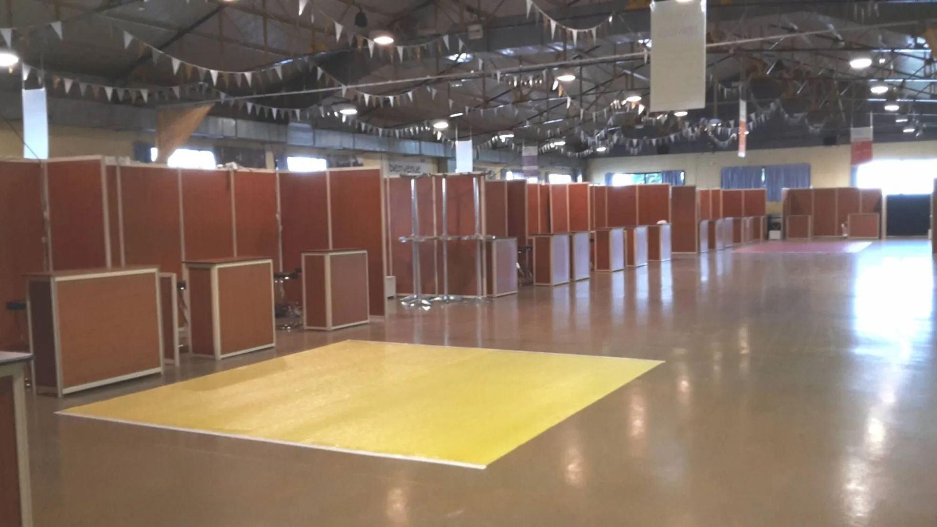 Cloison avec éclairage, moquette et mobilier pour un salon.